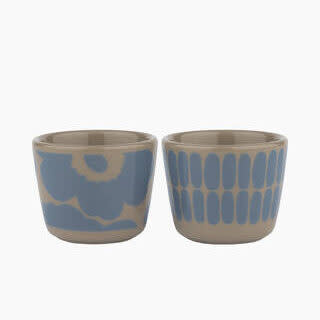 set van twee eierdoppen, de ene met het alku patroon, de ander met de unikko bloem