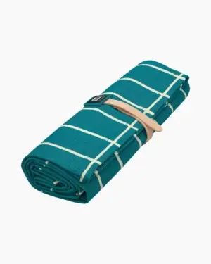 Dit picknick kleed heeft een vlekafstotende afwerking en kan worden opgerold en vastgemaakt met een afneembare leren riem.